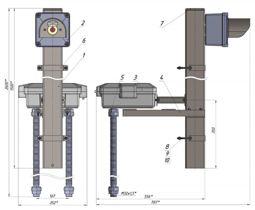 Комплекс соединительной муфты и стойки с ПКУ изготовлен с муфтой композитной герметизированной на 28 пружинных клемм с двумя вводами Dn 32  из термореактивного прессматериала по SMC-технологии. Стойка с кронштейнами под громкоговоритель,  ПКУ, кронштейн крепления муфты, скоба –  сварные металлические конструкции с защитным покрытием по  ГОСТ 9.307-89, крепежные элементы из нержавеющей стали  Сталь 10Х17Н13М2т ГОСТ 5949-75 AISI 316 или аналог А2, А4, использование гаек самостопорящихся по ГОСТ ISO 7040-2014.